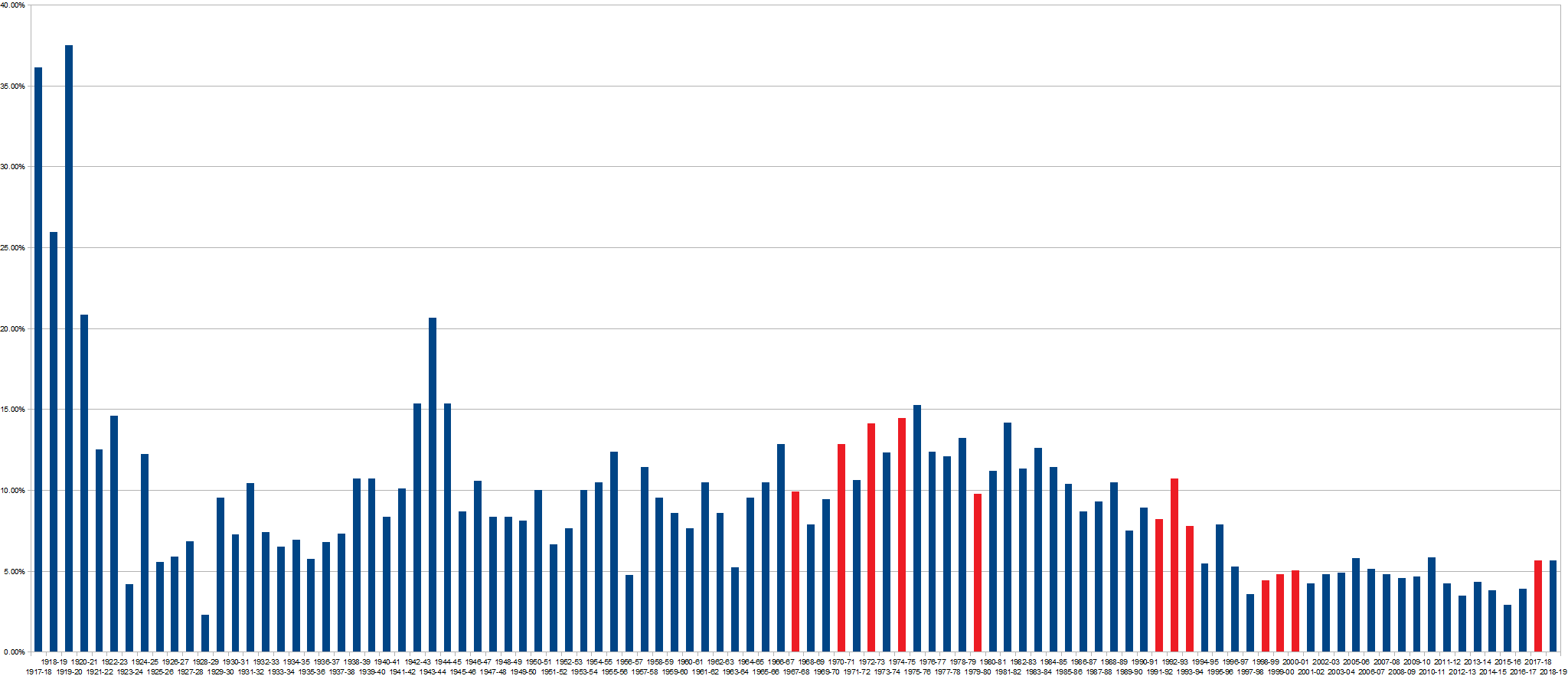 - As expected, we see an upward in the expansion years of 1970-71, 1972-73, 1974-75, 1991-92, 1992-93, 1998-99, 2000-01, and 2017-18.