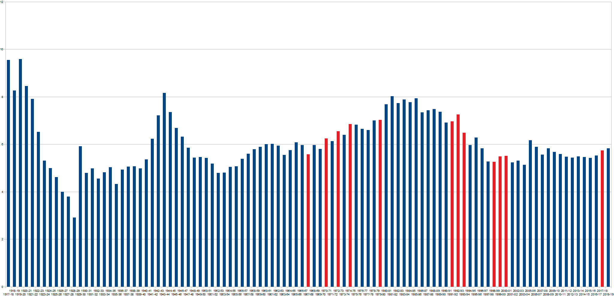 - On the other hand, we see drops in 1993-94 and 1999-00.