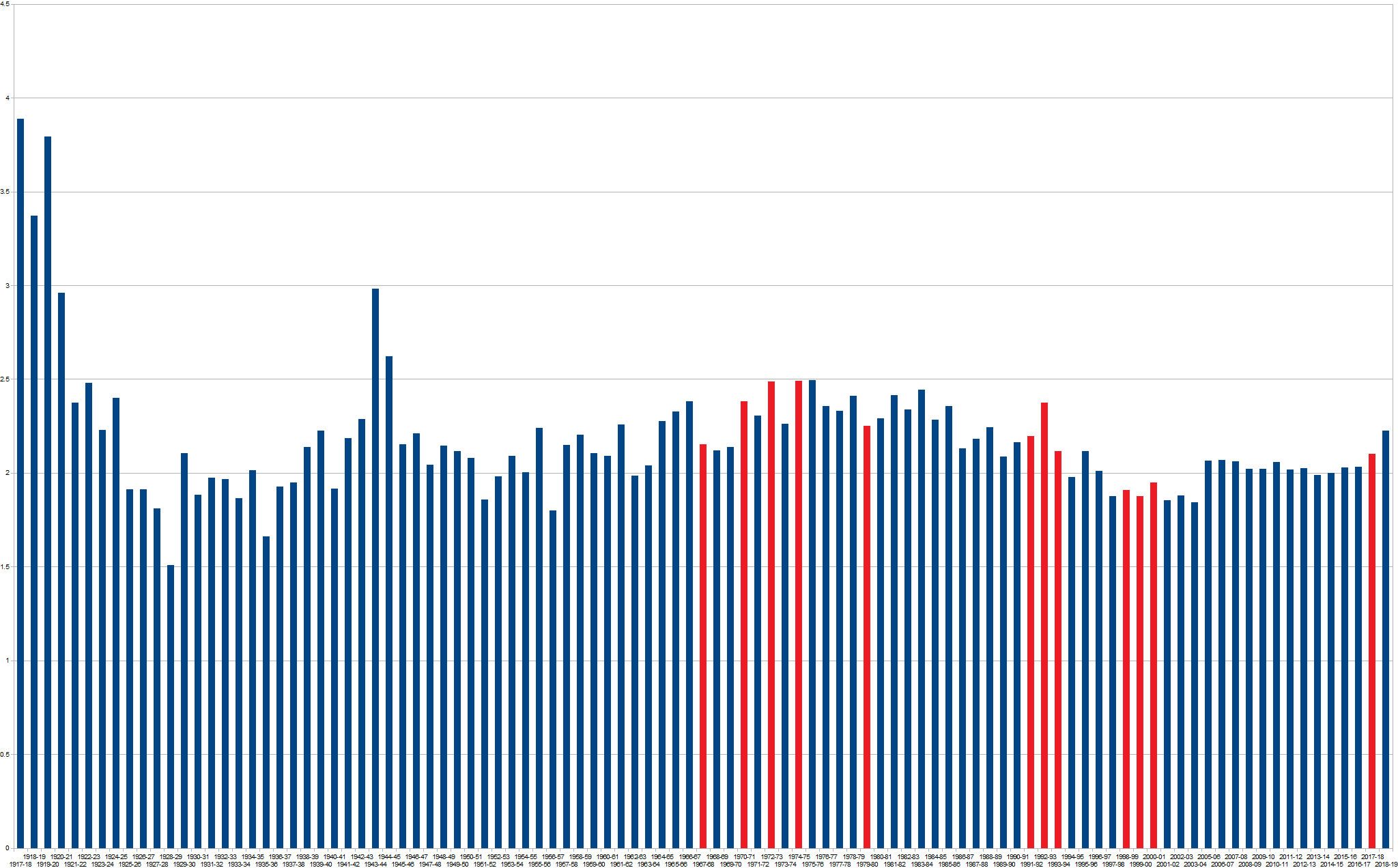 In other words, if we remove the two big years of WWII, there has been exactly one year since the forward pass was legalized in all zones that the average margin of victory has been outside the 1.8-2.5 goals/game range.