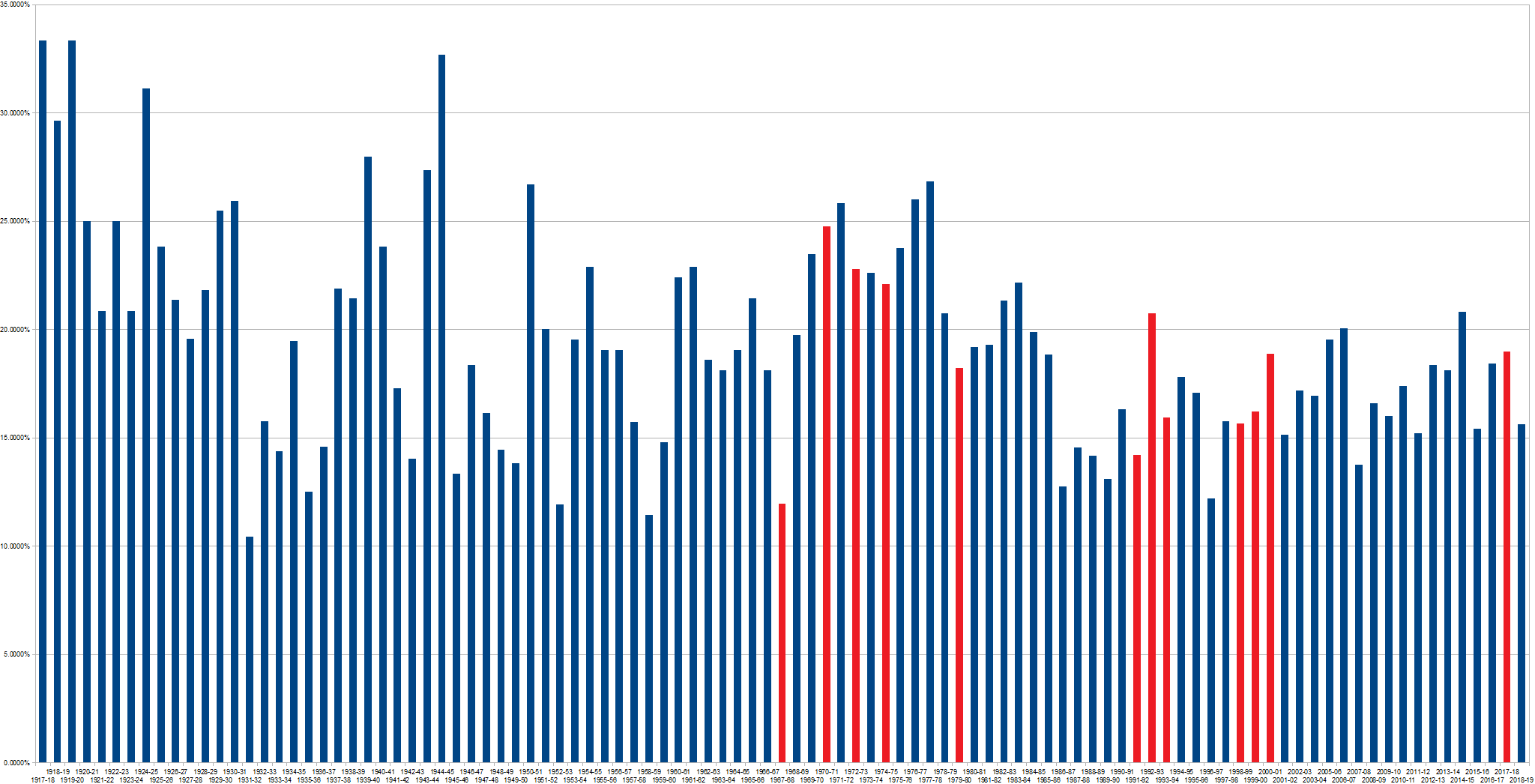 - The 1917-18 through 1998-99 seasons are exactly as they would have appeared in the newspapers: wins-losses-ties. This will produce a league in which an average record is .500.